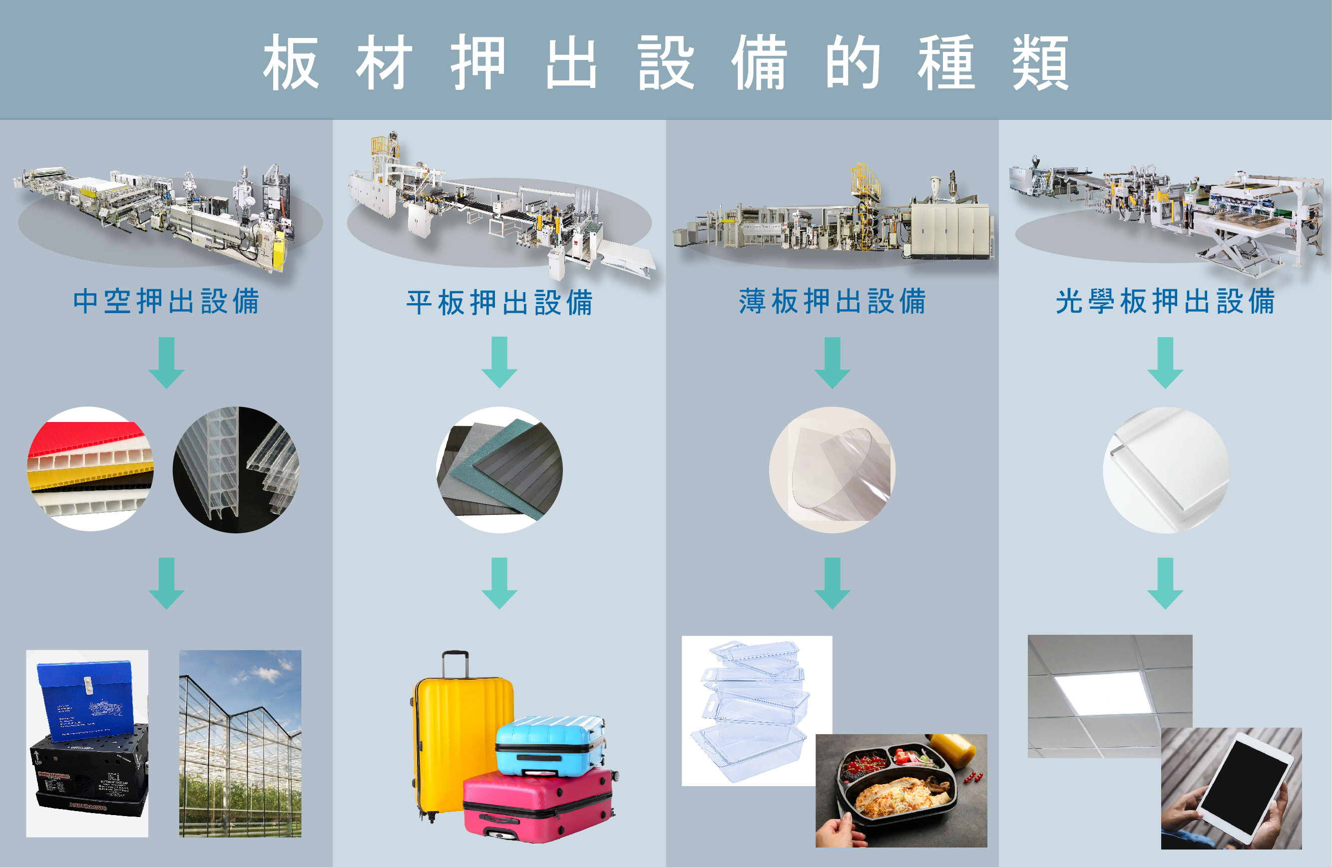 板材押出機可根據不同的模具搭配,分別產出不同形式的板材;分別為中空、平板、薄板各具有不同特性,依照其特性進一步做熱塑成型等各式加工處理,用途甚廣,廣泛應用於文具製品、廣告牌、行李箱、汽車零件、包裝材等。